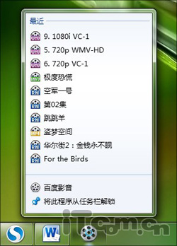 不過(guò)百度影音對于Win7特性的支持還不是很高,目前僅提供了Jumplist菜單和AeroSnap的簡(jiǎn)單支持,而對于Jumplist快捷操作以及任務(wù)欄實(shí)時(shí)縮略圖卻沒(méi)有提供。