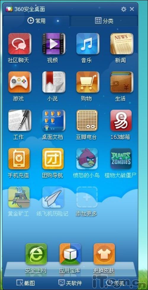 所謂360安全桌面就是整合了“社區聊天、視頻、音樂(lè )、新聞、游戲、小說(shuō)、購物”等日常必備軟件的一款桌面管理軟件。