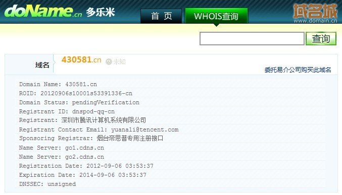 昨晚八點(diǎn)開(kāi)始,騰訊公司注冊了數萬(wàn)個(gè)五位數字和六位數字.cn域名,意在保護五位數和六位數QQ號域名。目前這些域名正在審核中。筆者發(fā)現,騰訊公司從昨天晚上八點(diǎn)開(kāi)始一直持續到今日凌晨4點(diǎn)左右,將五數字.cn域名從10000.cn開(kāi)始到99999.cn之間的,六數字.cn域名從100000.cn到430581.cn之間的所有未注冊.cn域名通過(guò)一家名為煙臺帝思普專(zhuān)用注冊接口的注冊商全部注冊一空。