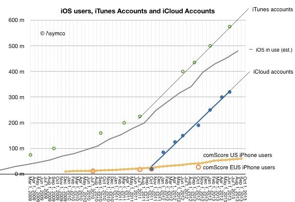 圖表中給出了擁有已激活iTunes賬號的用戶(hù)總數,以及擁有iCLoud賬號的用戶(hù)總數;此外,地區性的iPhone數據則對iOS設備的用戶(hù)增長(cháng)提供了某種額外的測試。最終得出的結果是,iOS活躍用戶(hù)總數“大約為5億人”,每個(gè)月增加1100萬(wàn)人左右。