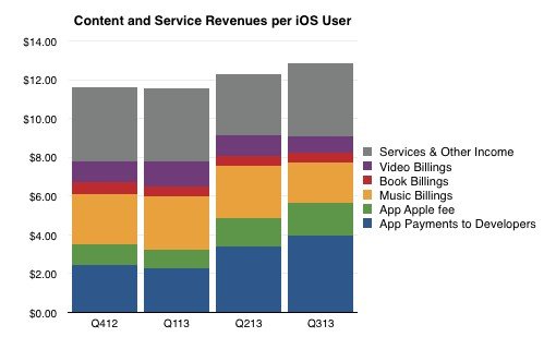 在得出iOS生態(tài)系統中共有大約5億名活躍用戶(hù)的推斷以后,下一步要做的事情就是對這些用戶(hù)所能創(chuàng )造的價(jià)值進(jìn)行測量。根據蘋(píng)果公布的數據,iTunes服務(wù)的季度總營(yíng)收為42.6億美元;再考慮到媒體零售和購買(mǎi)活動(dòng)相關(guān)數據,iOS用戶(hù)平均季度支出的圖表就呼之欲出了。詳見(jiàn)下圖: