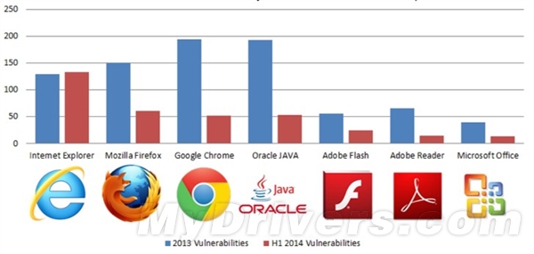 說(shuō)到漏洞最多的軟件,大家腦海中浮現的無(wú)非是Flash、Java、IE、Chrome這幾款漏洞大戶(hù)。根據Bromium公布的2014年上半年漏洞報告,IE不僅是上半年漏洞最多的軟件,而且還是唯一一個(gè)半年漏洞就超過(guò)去年一年漏洞總量的軟件。