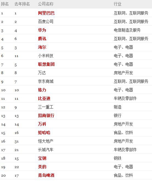 《財富》最受贊賞的中國公司全明星榜前20位企業(yè)一覽 (紅色表示該公司在過(guò)去六年中連續上榜)
