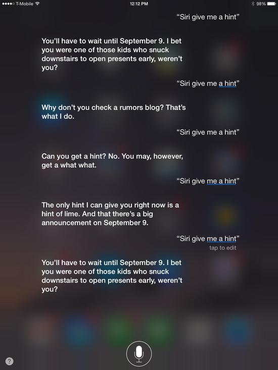 更準確地說(shuō),Siri在回應這個(gè)問(wèn)題時(shí)真是又萌又調皮,她會(huì )讓這些“焦急的人”耐心等到9月9日去了解一切。