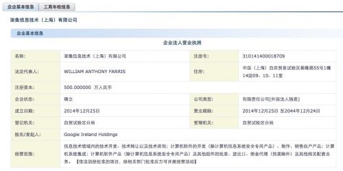 工商資料顯示,澎集信息成立于2014年12月25日,股東為Google Ireland Holdings(谷歌愛(ài)爾蘭控股),法人代表是William Anthony Farris,注冊資本為500萬(wàn)元。該公司的經(jīng)營(yíng)范圍包括:信息技術(shù)領(lǐng)域內的技術(shù)開(kāi)發(fā)、技術(shù)轉讓以及技術(shù)咨詢(xún);計算機軟件的開(kāi)發(fā)(除計算機信息系統安全專(zhuān)用產(chǎn)品)、制作,銷(xiāo)售自產(chǎn)產(chǎn)品;計算機系統集成;計算機軟件產(chǎn)品(除計算機信息系統安全專(zhuān)用產(chǎn)品)及其他組件的批發(fā)、進(jìn)出口、傭金代理(拍賣(mài)除外)及其他相關(guān)配套業(yè)務(wù)。