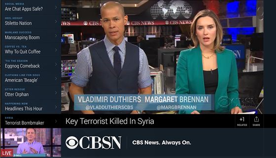 2014年底,CBSN首先在Xbox One提供,后來(lái)到達Amazon Fire TV,Android TV,Apple TV,Roku等平臺。這些平臺的共同特點(diǎn)就是類(lèi)似國內小米、樂(lè )視等盒子或互聯(lián)網(wǎng)電視機,存在繞過(guò)有線(xiàn)或無(wú)線(xiàn)電視網(wǎng)觀(guān)看視頻節目的方法,也就是所謂的OTT服務(wù)。除此之外,CBSN也可以在CBS新聞的官方網(wǎng)站、iOS和Android客戶(hù)端收看。