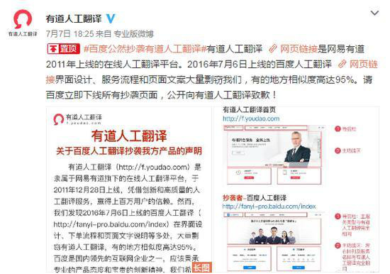 7月7日,有道人工翻譯官方微博發(fā)布長(cháng)圖文,詳細列舉了6日上線(xiàn)的百度人工翻譯在界面設計、服務(wù)流程和頁(yè)面文案等方面剽竊有道人工翻譯,有些地方的相似度達到95%,并責令百度立即下線(xiàn)所有抄襲頁(yè)面,公開(kāi)致歉。原微博已經(jīng)獲得3600多次轉發(fā),并引發(fā)不少主流媒體關(guān)注。