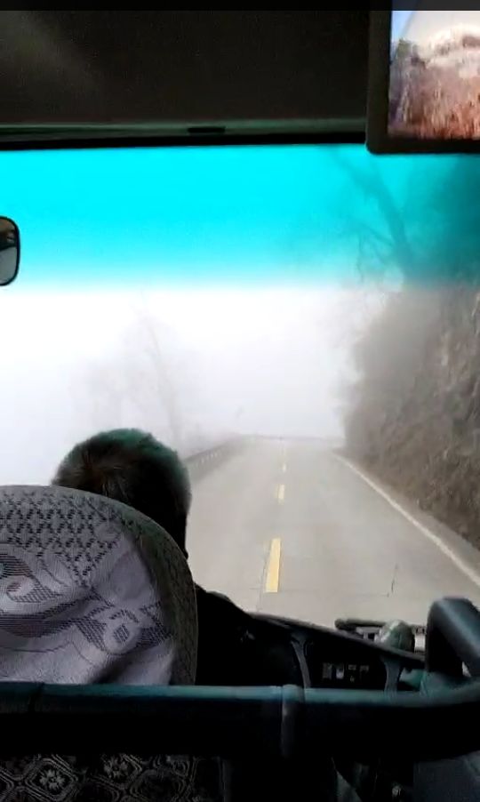 山路又急又陡,早晨的霧氣也還沒(méi)散開(kāi),大家懷揣著(zhù)不安又期待的心情看著(zhù)窗外漸變的景色