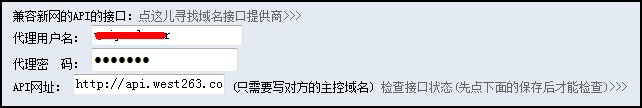 這里要求輸入代理用戶(hù)名、代理密碼以及API網(wǎng)址。代理用戶(hù)名和密碼參見(jiàn)說(shuō)明文檔開(kāi)頭設置的密碼。API網(wǎng)址填寫(xiě):http://api.west263.com。如圖: