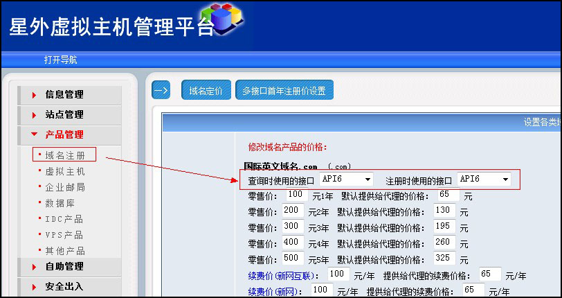 然后點(diǎn)擊“產(chǎn)品管理”——“域名注冊”,將右側的所有域名查詢(xún)接口和注冊接口都選擇“API6”,如圖: