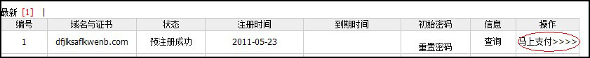 系統會(huì )提示“預注冊成功,馬上付費>>>”,點(diǎn)擊后系統會(huì )轉到域名管理列表,您剛注冊的域名會(huì )提示“預注冊成功”,點(diǎn)擊最右側的“馬上支付>>>>” 就正式注冊成功了,如圖: