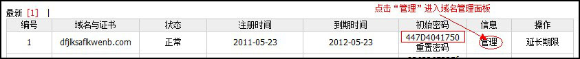重置密碼后,會(huì )顯示一個(gè)初始密碼,點(diǎn)擊右側的“管理”就可以登陸域名管理面板了。如圖: